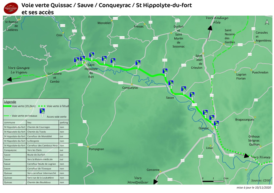 Dédiée aux piétons, cyclistes, rollers et aux personnes à mobilité réduite, cette voie offre une belle balade à la découverte des deux villages et de leurs sites remarquables : Quissac, Sauve, moulins, Pont Vieux, Conservatoire de la Fourche, …