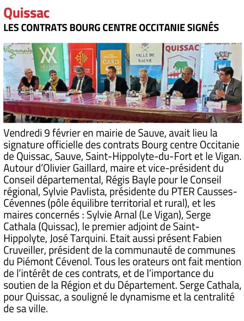 Le contrat cadre Bourg Centre permet à la commune de Quissac de bénéficier d’un plan d’accompagnement aux investissements renforcés sur 6 ans (2022-2028) pour des projets intercommunaux et communaux d’amélioration du cadre de vie, de mobilité, de transition énergétique et écologique, et des projets de développement économique et touristique ainsi que d’équipements sportifs et culturels…